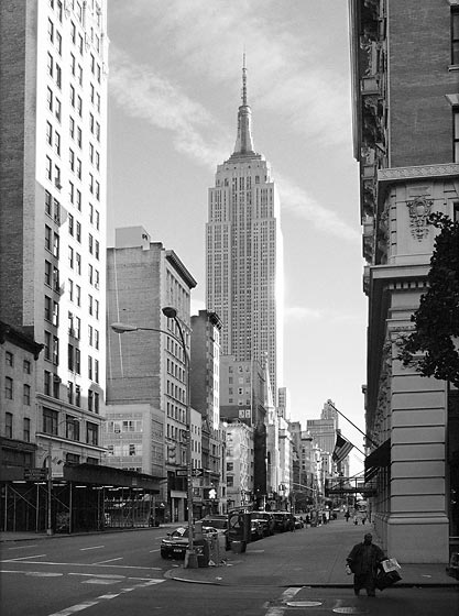 | The Flatiron Building was built in 1902, and is considered to be the oldest remaining skyscraper in New York. At 87 metres or 285 feet tall, it must have been very imposing at the time. It is still a striking building, mainly for it's amazing shape. The shape is dictated by the fact that it is situated at the three way intersection of Broadway, 23rd Street and Fifth Avenue. It was now about 8.00 am on a Sunday morning, and the city was just beginning to stir. After breakfast at a restaurant across the road from the Flatiron Building I finally started to feel human again, and started walking up Fifth Avenue to my next destination, the Empire State Building. The Empire State Building was built in 1931, constructed of steel with stone cladding in the Art Deco style. After many years as New York's highest building it now once again holds that privilige, and every year over 3.5 million people visit its observatory deck on the 86th floor 1,050 feet (320 metres) above street level. The building itself has 102 floors and is 1252 feet or 381 metres high. |