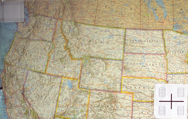 | At f/2 the MD lens has improved markedly to catch up to and even possibly surpass the MC version. The MC lens has naturally also improved, and in fact both lenses deliver excellent resolution at f/2. The double lines of some of the highways are visible in the crops from both lenses, but possibly slightly more clearly in the MD version.. When you consider that these lines are approximately 0.5mm apart on the original poster that is a quite incredible result. The corner sharpness of the two lenses appears to be very similar at f/2. Overall, I feel that at f/2 the MD lens has very fractionally outperformed the MC lens, but the difference between the two lenses is very difficult to pick even at a 100% crop at 5400 dpi. Certainly there would be no way to split the two lenses based upon prints, even with very big enlargements. |