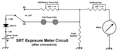 applications, just its forward voltage drop. Any forward biased diode will drop a certain amount of voltage depending on its type, construction, the current flowing through it and to some extent, its temperature. The type and construction of a diode used is the major factor in the amount of forward voltage drop it has. For instance, a Germanium diode will typically drop .4 volts or more and a Silicon diode will drop about .6 Volts, neither of these types will suit our needs. Since a Silver Oxide Cell delivers about 1.6 volts and a Mercury Cell reads about 1.35 volts we need a voltage drop of about .25 volts. It turns out that a forward biased 1N5711 Silicon Schottky Diode will drop the required .25 volts at the current range (10 ~ 200ua.) of the SRT metering circuit. While temperature will affect this voltage drop a little, the effect will be extremely small at the temperature range of the camera in normal use. Photography in Antarctica or the Sahara Desert might be another story, but the mechanically operated SRT will likely have other problems long before those extreme temperature can cause any appreciable exposure errors. Temperatures of about 32º to 95º F, should be just fine. From my measurements at room temperature, the 1N5711 Schottky Diode was "spot on", reading a .25 volts drop, thus delivering 1.35 volts the SRT's metering circuit, perfect for our application. Other Schottky Diodes (1N6263, BAT41, BAT81, BAT82, BAT83) have a similar type and construction but I have not tested them. Caution: The handling of the diode, as with any semiconductor requires certain precautions to prevent damaging it. You should protect it from static discharges and excessive heat. Before touching the diode leads be sure to ground yourself to a grounded metal surface to discharge any build up of static on your body. When soldering the diode, try to limit the time of heating to about 2 seconds. |