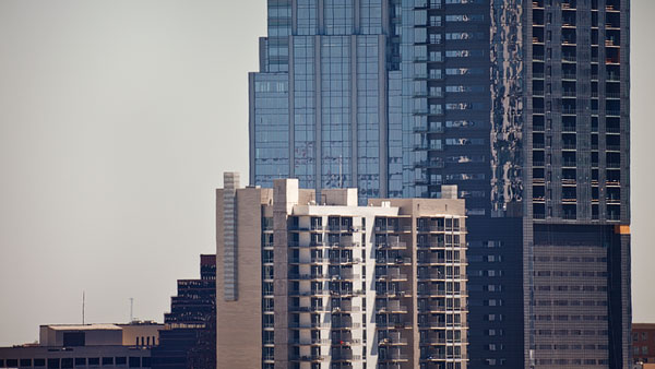 Austin, Texas skyline from 2.2 miles, seen with a 40mm lens, approximating the natural viewpoint of the human eye. |